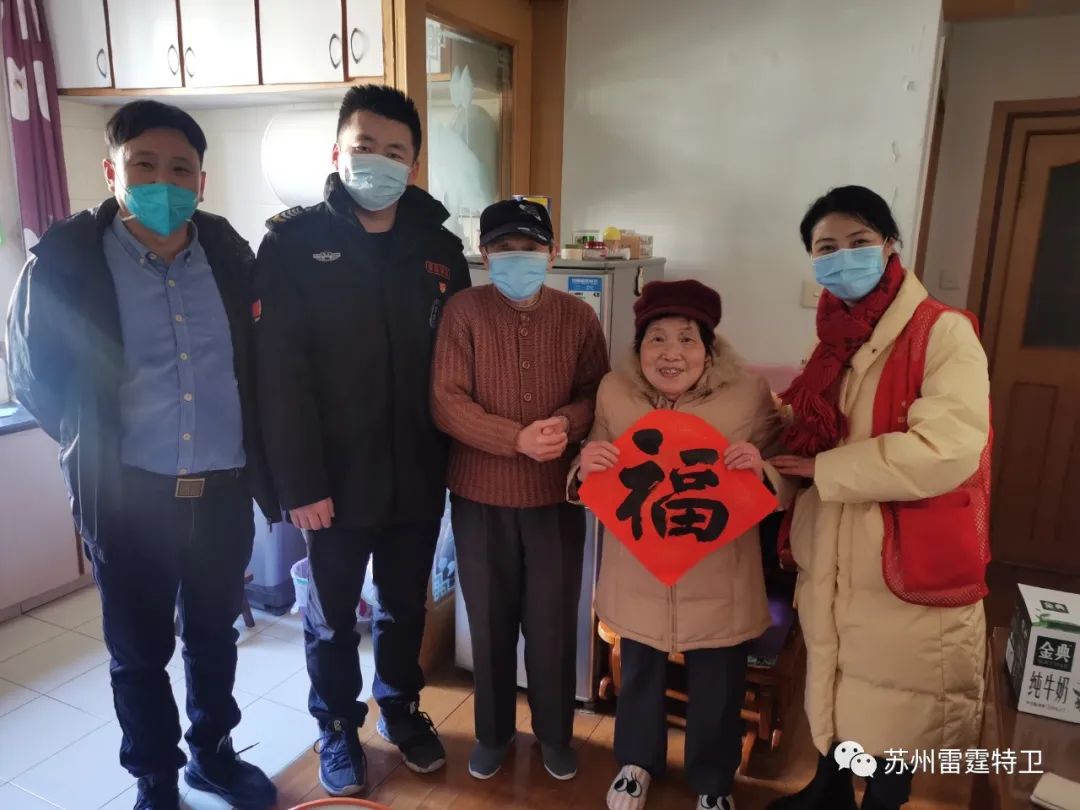 在2023年新春佳节即将到来之际,1月16日,苏州市雷霆特卫保安服务有限公司党支部、工会成员,在娄葑街道葑南路社区、苏安南社区党支部的带领下,为高龄党员、百岁老人、困难家庭送去爱心物资和新春祝福。
